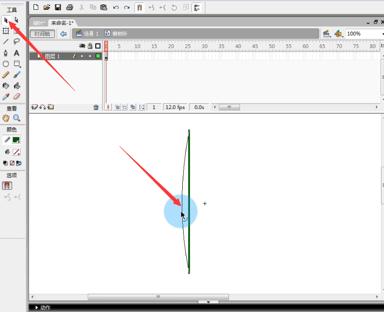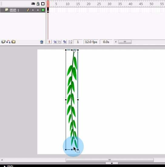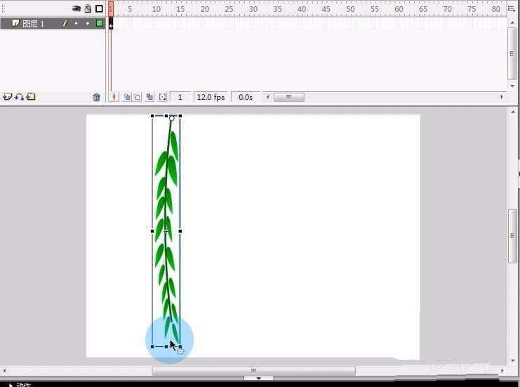 5、然后我們回到場景將制作好的柳樹葉拖到舞臺。選擇任意變形工具將柳樹葉的中心點(diǎn)拖至到柳條兒的尾部。再將整個(gè)柳樹葉壓扁一些。