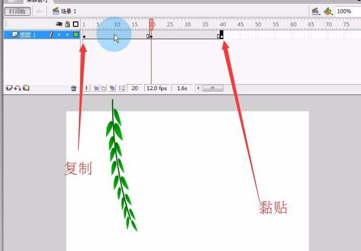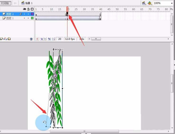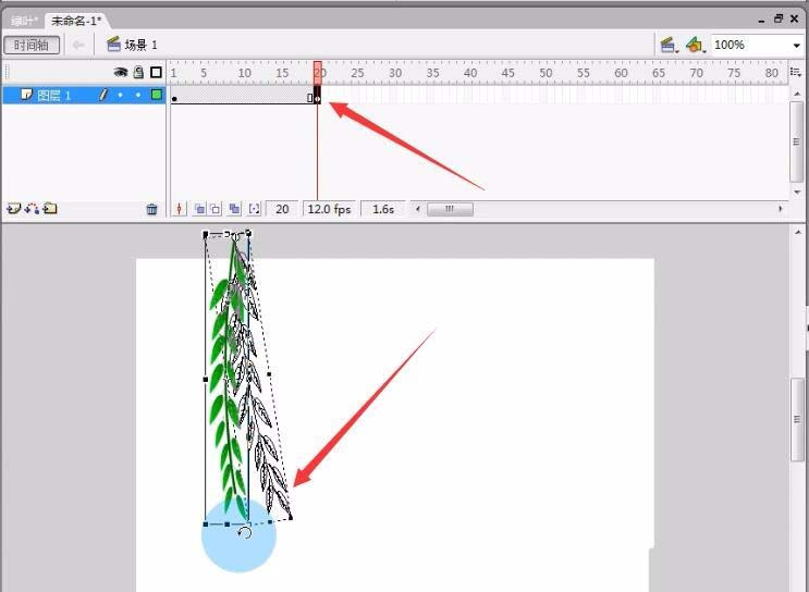 6、將柳條兒放置舞臺的頂部,根部要高于舞臺。在第20幀處插入關(guān)鍵幀。然后將柳梢部分圍繞中心點(diǎn)向右拉動偏移,作為擺動。然后將第一幀復(fù)制到第40幀。關(guān)鍵幀之間創(chuàng)建補(bǔ)間動畫。一條擺動的柳葉制作完畢。我們可以任意添加幾根柳樹條。制作不同方向的擺動。還可以添加樹葉飄落的效果。