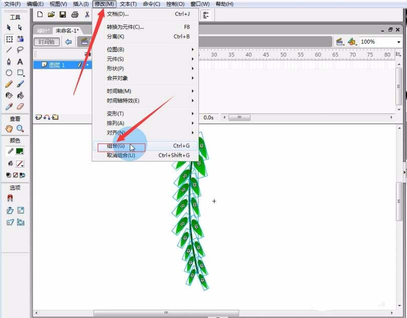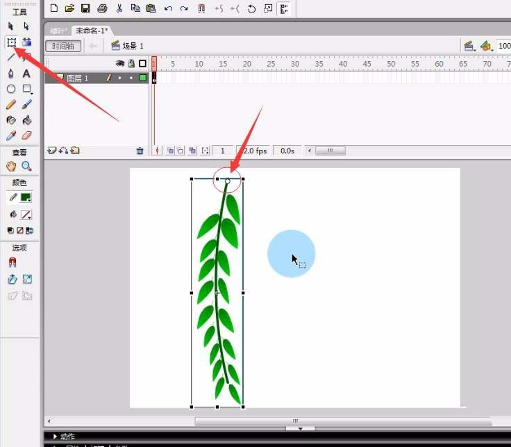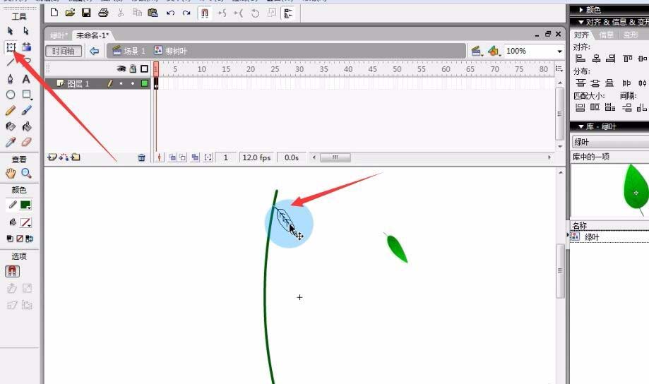 3、調(diào)出之前做好的樹葉圖形元件,將它拖入到舞臺,點(diǎn)擊任意變形工具,將它變形拖至與線條匹配的葉子大小。將樹葉兒安置在線條上。