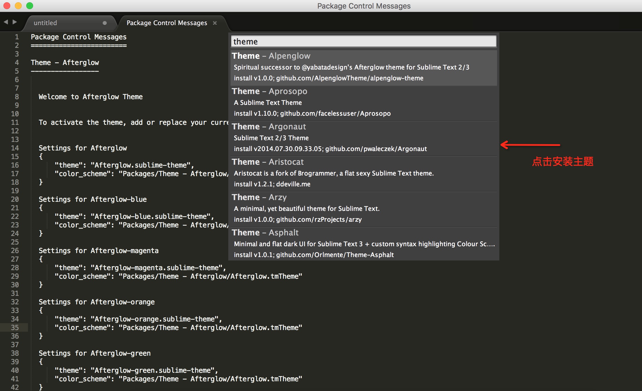 第二步:在Package Control輸入框中輸入PCI,快速模糊匹配到Package Control:Install Package 命令,點擊執行。然后等待Package Control加載所有的插件,在重新彈出的輸入框中輸入theme,以快速模糊匹配到所有主題插件。點擊任意主題名稱進行安裝。