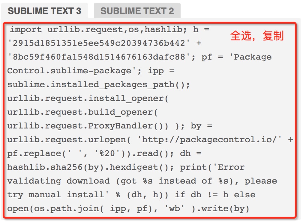 第一步:選擇你的Sublime Text對應版本的安裝代碼,Cmd+C 復制