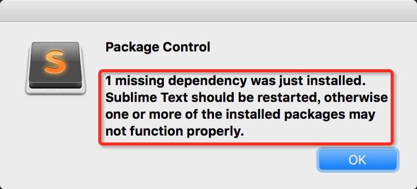 錯誤2:1 missing dependency was just installed. Sublime Text should be restarted, otherwise one or more of the installed packages may not function properly.