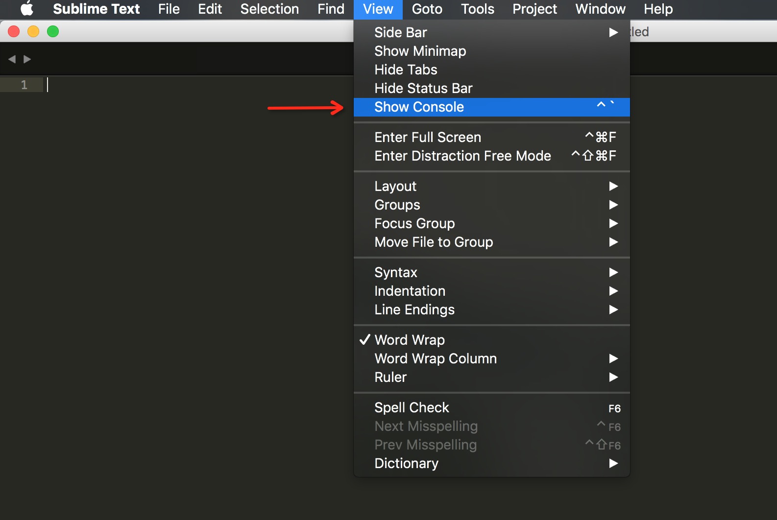 第二步:打開Sublime Text;找到并點擊View -> Show Console(或使用快捷鍵 Control+~ )
