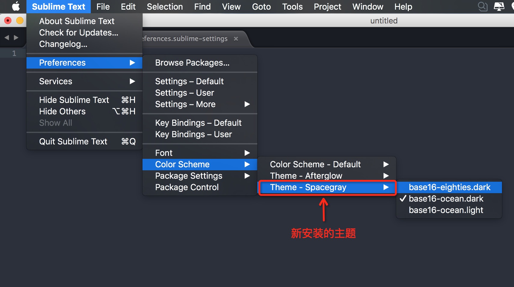 依次點擊 Sublime Text -> Preferences -> Color Scheme , 選中新安裝的主題,選擇其子主題進行使用。