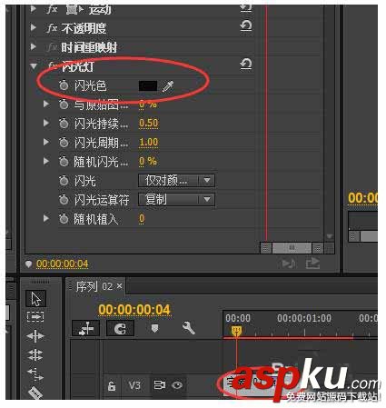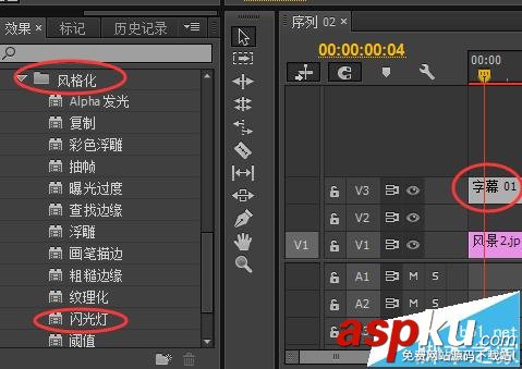 3、添加”閃光燈“特效。取景框畫好以后,在視頻特效中找到“風格化”中的“閃光燈”效果,然后將“閃光燈”效果拖拽到字幕素材上,然后在效果控件中找到“閃光燈”效果的下拉三角,調節閃光燈顏色為黑色。此時,閃光燈效果就出來了。