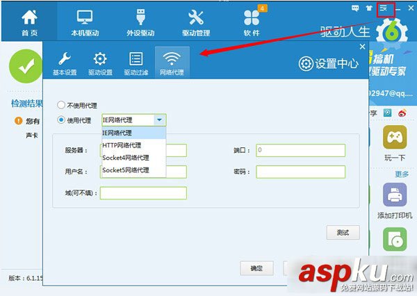 這版驅(qū)動(dòng)人生還新添加了代理聯(lián)網(wǎng)的功能,何為代理聯(lián)網(wǎng)呢?通俗點(diǎn)說就是網(wǎng)絡(luò)翻墻,由于部分網(wǎng)站和應(yīng)用的限制,導(dǎo)致驅(qū)動(dòng)人生無法正常使用。有這部分困擾的童鞋注意了,點(diǎn)擊驅(qū)動(dòng)人生右上角的設(shè)置,彈出有網(wǎng)絡(luò)代理的窗口,勾選使用代理,然后填好下面的設(shè)置就可以愉快的用驅(qū)動(dòng)人生更新安裝驅(qū)動(dòng)啦。