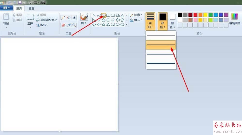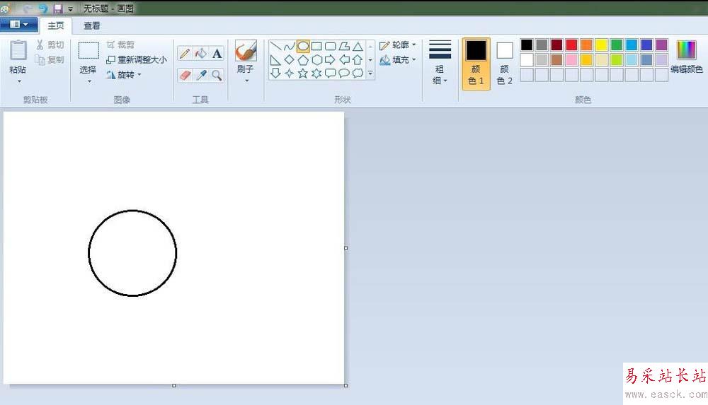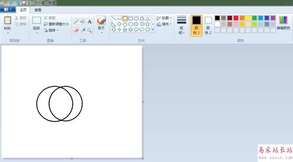 2、蘋果:點擊“橢圓形”按鈕,線條粗細(第二個),先在“畫紙”適當位置上畫出一個圓,再畫一個和第一個有部分重疊的圓;點擊“橡皮擦”按鈕,將重疊的線條擦掉。