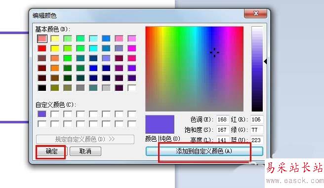 5、在色彩面板中點擊添加到自定義顏色,添加一個新的顏色,點擊確定。