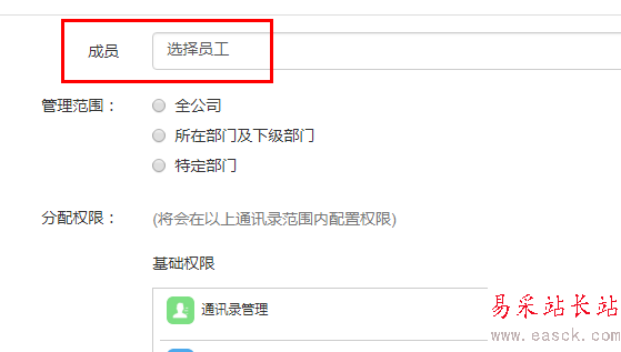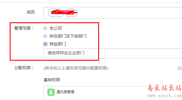 5、管理范圍中設(shè)置子管理員的權(quán)限范圍,可以選擇全公司、所在部門或指定部門