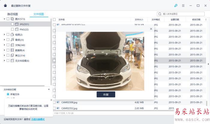 結束后,你可以預覽一些文件,點擊“恢復”,找回文件。當然有可能你會發現有些丟失的文件還是沒有找到。莫急莫急,你還可以試試“萬能掃描模式”。