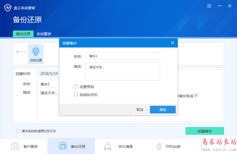 備份還原:點擊創建備份并選擇需要備份的盤,開始備份即可。