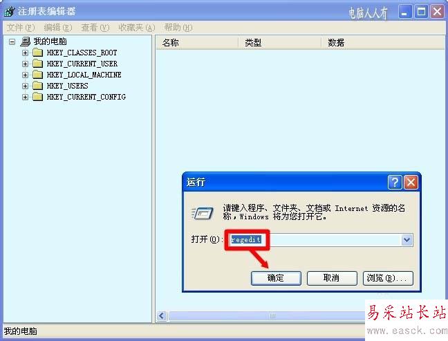 2、在【開始】→【運行】中輸入: regedit 按回車鍵之后,打開注冊表編輯器。