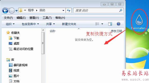 3、將雨滴桌面(Rainmeter)的快捷方式復制到“啟動”文件夾中,如下圖所示,這樣下次開機時就會自動開啟雨滴桌面。