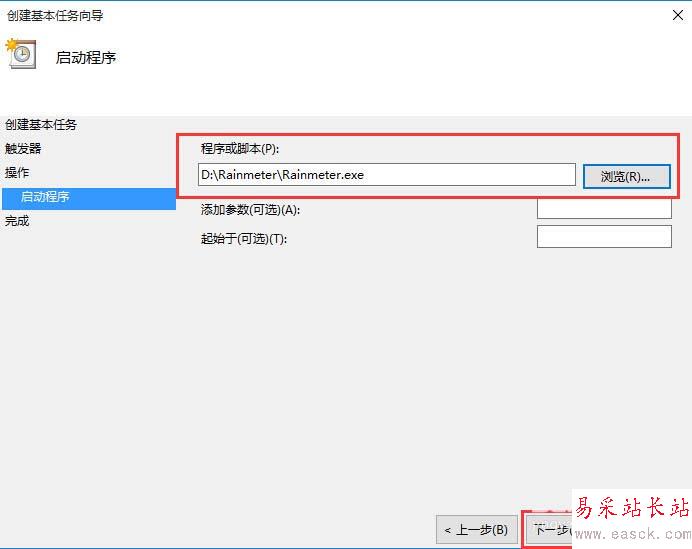 6、進入到“啟動程序”一欄中,點擊右側的“瀏覽(R)...”按鈕,定位到你的Rainmeter主程序Rainmeter.exe。“添加參數(shù)”和“起始于”選項不用填寫,如下圖所示,然后單擊“下一步”按鈕。