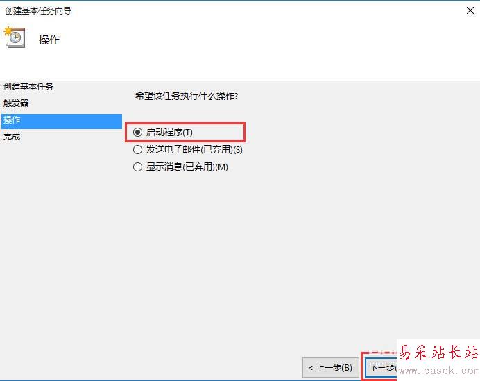 5、進入“操作”一欄中,選擇“啟動程序(T)”,然后點擊“下一步”按鈕,如下圖所示。