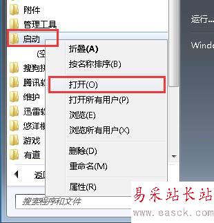 2、右擊“啟動”文件夾,在彈出來的下拉框中選擇“打開(O)”,然后文件資源管理器中會自動打開“啟動”文件夾,如下圖所示。
