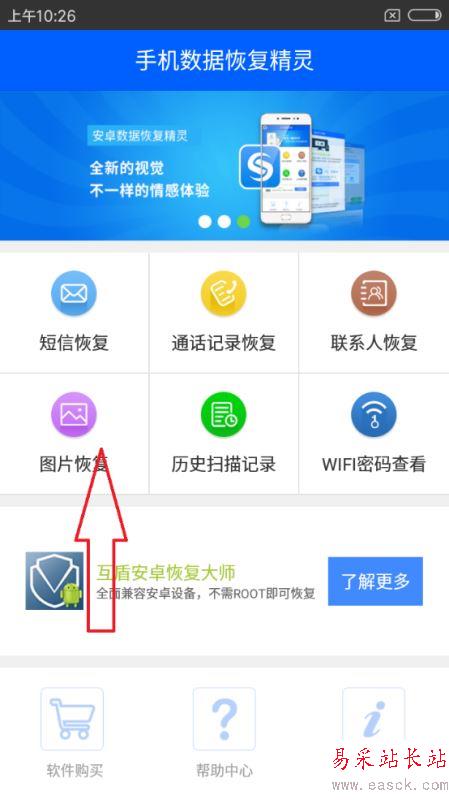 2.打開運行手機數(shù)據(jù)恢復精靈,在軟件界面可以看到六個不同的功能塊,還可以在軟件中間看到互盾安卓恢復大師,該軟件可以在電腦上恢復手機數(shù)據(jù),如果想了解更多,點擊“了解更多”按鈕即可,此時我們點擊“圖片恢復”,然后進行下一步操作。