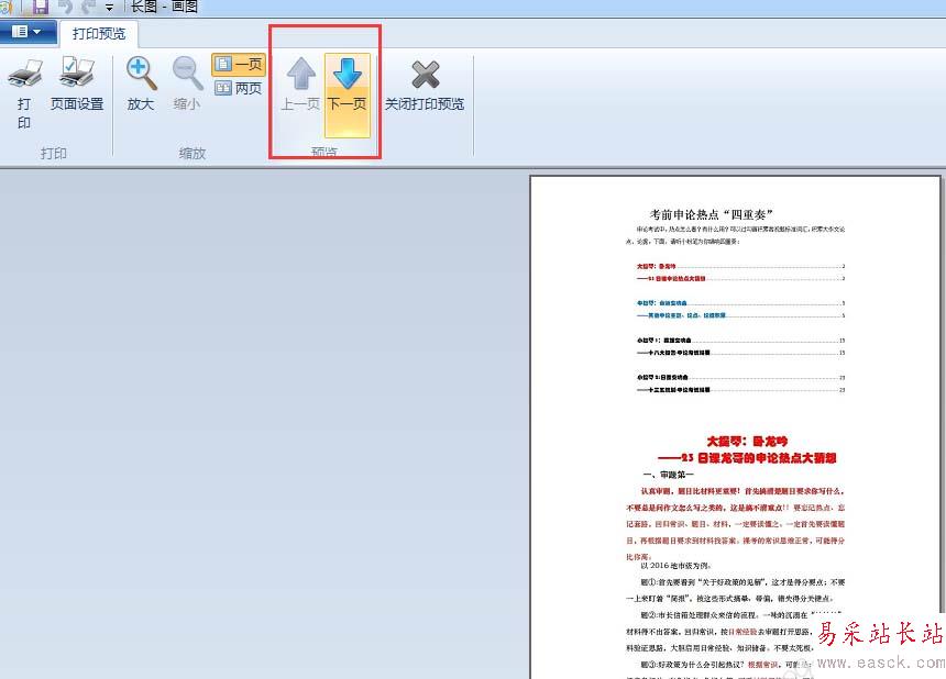 4、通過打印預覽查看頁面設置是否合適。打開【文件】【打印預覽】,可以點擊【下一頁】翻頁預覽。通過觀察圖片兩側空白多少和圖片中字的大小,確定前面設置的頁數、頁邊距是否合適。如果圖片兩側空白大、字太小,就適當增加頁數或者頁邊距。總的原則就是,打印出來的字大小適中看得舒服、頁邊距適中不浪費紙。不過,如果長圖分辨率不高的話,放大打印出來后會比較模糊。