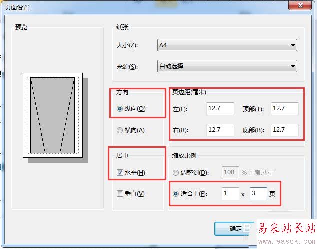 3、設置【頁面設置】。在【頁面設置】里,方向選擇【縱向】,居中選擇【水平】,縮放比例選擇【適合于】,后面有兩個輸入框。前面框填1,表示打印成一頁寬。后面的框填幾就表示打印成幾頁,例如輸入1×3頁,表示把長圖打印成1頁寬的A4這樣的3頁。可以根據圖片長度輸入大概頁數。還可以根據需要修改頁邊距大小。這兩項都可以預覽后看看情況再修改調整。點擊【確定】返回。