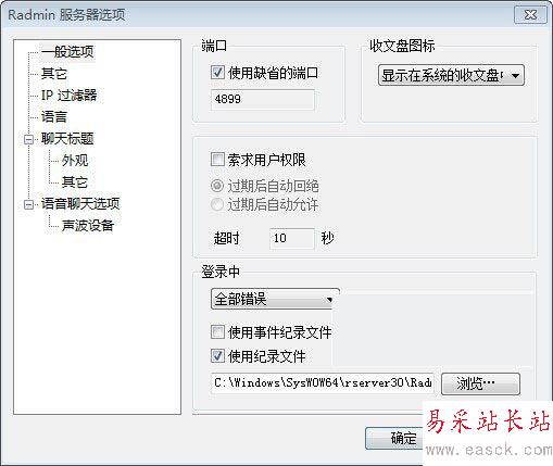 5、在以上圖點“選項”按鈕,彈出“Radmin服務器選項”,可以設置端口(默認為4489)、暫停聯機模式,ip過濾等,設置完關閉即可。如下圖所示: