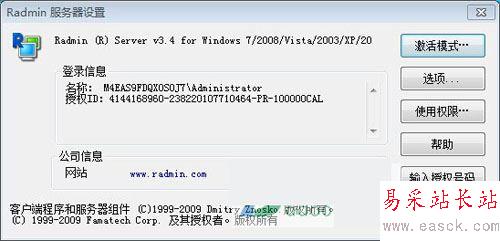 4、重新運行“Radmin服務器設置”程序,這時登陸信息欄會顯示授權ID,說明已經激活成功。如下圖所示: