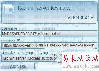3、運行解壓包中的keymaker.exe破解程序,點左下角的“Activate”按鈕即可成功破解,激活后會顯示“Radmin server successfully activated!”。如下圖所示: