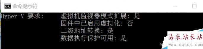 或者在命令提示符中輸入“systeminfo”也可以直接查看當前處理器是否能夠支持Hpyer-V虛擬機,顯示的4個項目必須全部都是“是”才行。想這個處理器是就是差點意思,用不上了。