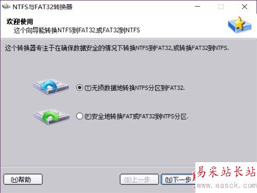 在彈出新界面中,選擇要進行轉換的方式。老司機的需求是從FAT32轉換到NTFS,勾選第二項即可。第一項的作用大多是需要磁盤放到Linux系統中使用。
