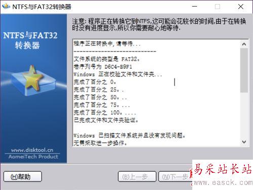 根據磁盤大小、已保存的文件容量將決定這個轉換過程的時長。完畢后,會有一個成功的提示。特別提醒,如果可能,請將被轉換的硬盤/閃存盤連接到筆記本上執行,如果突然斷電,磁盤很可能出錯,數據丟失。