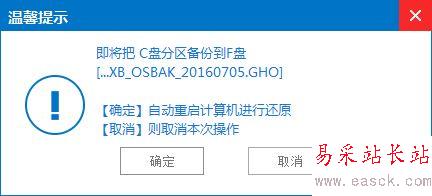 2、在彈出的提示框中確認系統盤區以及備份目標盤區無誤后再次點擊“確定”按鈕,電腦將會進入重啟狀態并開始進行系統一鍵備份;