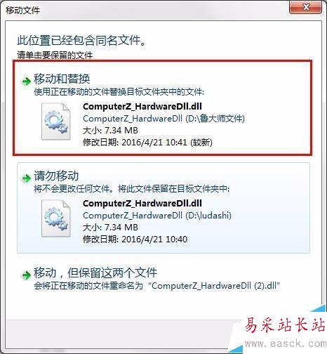 5、將ComputerZ_HardwareDll.dll 這個(gè)文件復(fù)制到魯大師安裝發(fā)的根目錄下面,注意選擇“移動(dòng)和替換這個(gè)選項(xiàng)”