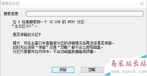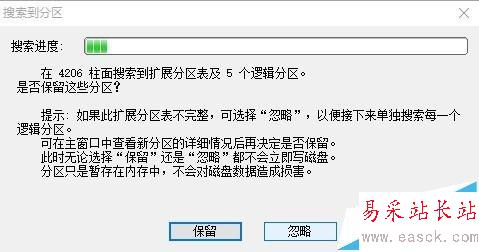 4、這步是關鍵。當提示搜索到“拓展分區表”,只要包含這5個字,就點忽略。然后其他搜索到的單獨的分區,就全部選擇保留。