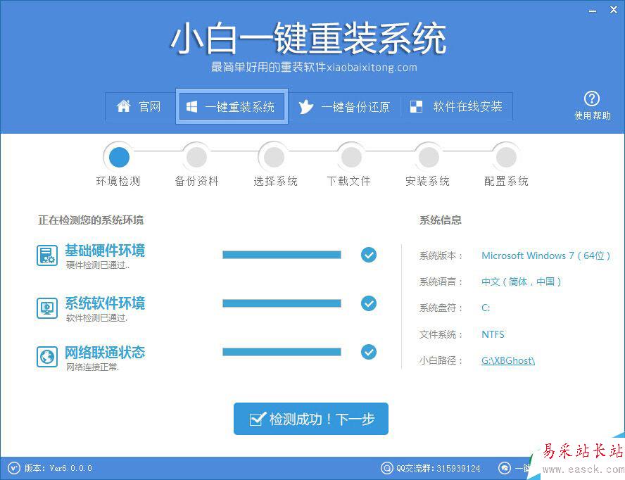 第二步、軟件自動檢測電腦軟硬件環境以及電腦網絡連通狀態,完成后點擊下一步按鈕