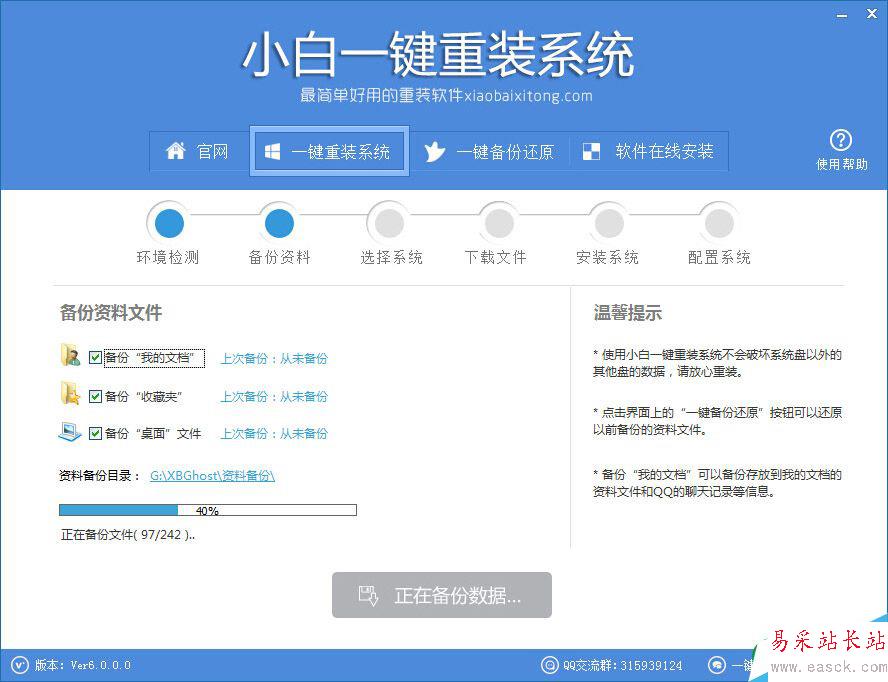 3、將C盤以及桌面的重要文件備份,或者使用小白內置的備份功能進行資料備份防止數據丟失;