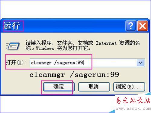 5、下面來介紹下另外一個參數 /sagerun:n 。簡單明了的說,前一個參數是設置清理的任務,而這個參數則是開始執行已經設置好的任務,n值推薦和上一個參數的n值保持一致。然后開始--運行輸入 cleanmgr /sagarun:99 ,確定
