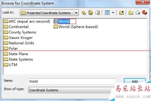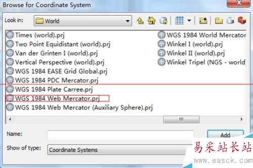 6、找到WGS 1984 Web Mercator.prj,點擊“Add”,如下圖所示: