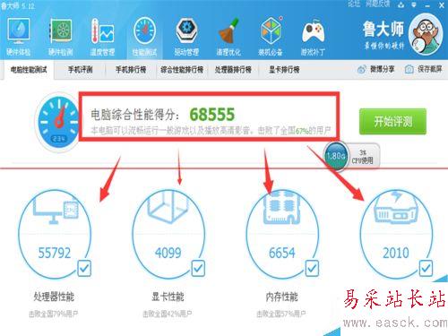 3、電腦的顯卡、處理器、內存、磁盤性能綜合測試得分68555,擊敗了全國67%的用戶。