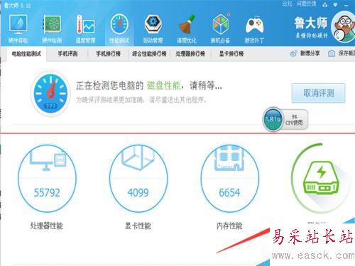 2、先點下性能測試,再點下電腦性能測試,如下圖很快已測試到第4項磁盤性能了。