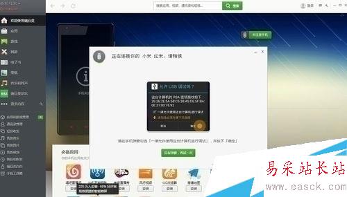 4:用數(shù)據(jù)線連接手機(jī)與電腦,電腦和手機(jī)上會提示是否允許USB調(diào)試,手機(jī)點擊確定。然后手機(jī)就會自動連接到豌豆莢。(如果手機(jī)提示是否安裝豌豆莢手機(jī)端,可以選擇安裝,也可以選擇不安裝)