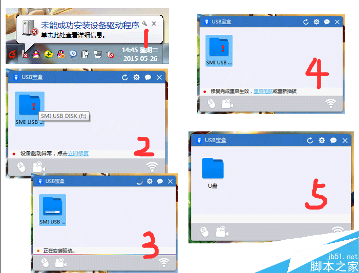 USB寶盒除了可以管理好手機,其他的USB連接問題也不在話下。有時我們電腦插入U盤,桌面右下角會彈出未能成功安裝驅動等提示,這時候就需要安裝相關驅動才可運行你的U盤了。解決方法,打開USB寶盒——雙擊出現如感嘆號USB設備進行修復——修復完成重啟電腦或重新插拔設備——完成修復。