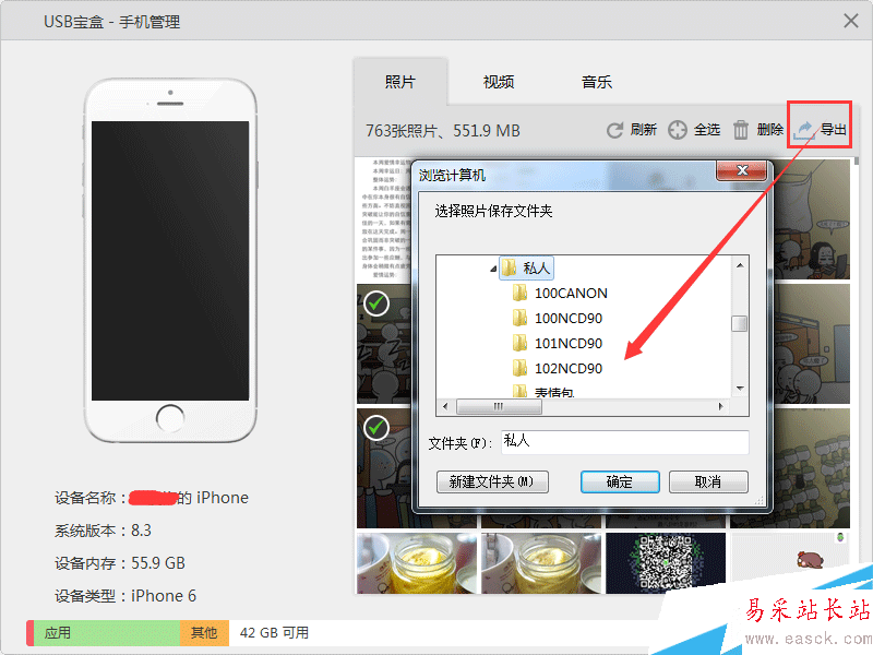 有了USB寶盒,除了一目了然的查看iPhone6里的圖片、視頻等,還可自行選擇或點擊全選按鈕進行全選,來刪除或導出手機里的文件(導入功能也即將上線),從手機管理界面左下方,可查看到手機的內存使用情況、系統版本等。