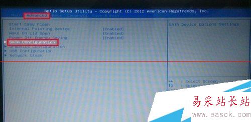 重啟電腦,出現開機畫面時可嘗試按鍵盤上的F1、F2或Del鍵進入bios,然后進入到bios界面后按鍵盤上的左右方向鍵“←,→”將光標移至“Advanced”,再使用上下方向鍵“↑,↓”,將光標移至“SATA Configuration”。如下圖所示: