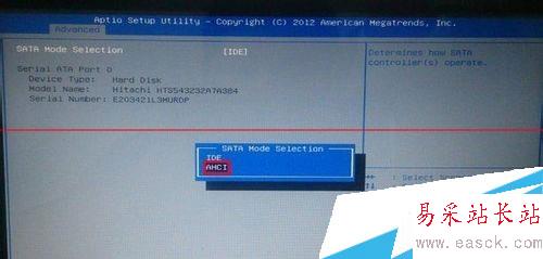 3、然后,按鍵盤上的回車鍵,在彈出的小窗口中,使用上下方向鍵“↑,↓”將光標移至“AHCI”更改(若原選擇為IDE時請更換另外一個選項),再按回車鍵進行確認。如下圖所示: