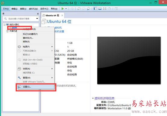 2.打開虛擬機,找到unbutu,右鍵“設置”,如圖所示。