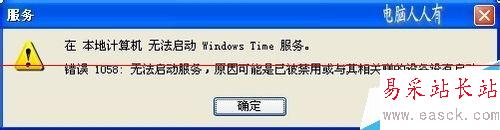 3、但此時會彈出出錯的警告提示:在 本地計算機 無法啟動 Windows Time 服務。錯誤1058:無法啟動服務,原因可能是已被禁用或與其相關的設備沒有啟動。