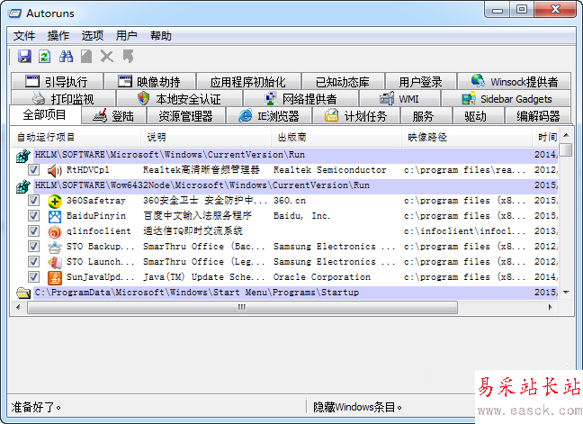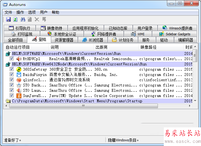 “全部”--顧名思義,全部的開機(jī)自啟動(dòng)項(xiàng)都在這個(gè)標(biāo)簽下啦。另外,它也是雙擊autoruns.exe彈出窗口缺省定位的標(biāo)簽,包括其他標(biāo)簽的所有內(nèi)容。