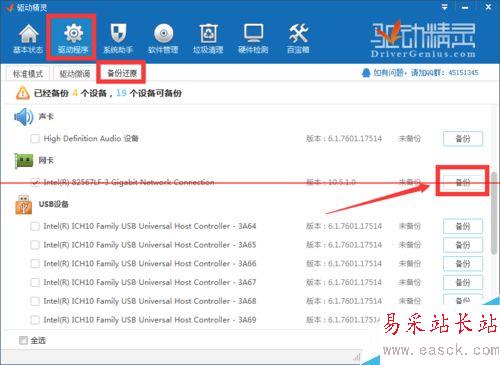 4、然后切換到“驅動程序”-“備份還原”選項卡,找到“網卡驅動程序”,點擊右側的“備份”按鈕,將網卡驅動進行備份。