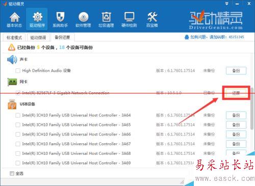 6、新系統中網卡驅動的還原方法:安裝并運行“驅動精靈”程序,切換到“驅動程序”-“備份還原”選項卡,點擊“網卡驅動”右側的“還原”按鈕即可還原對應的網卡驅動。