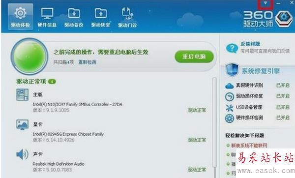 步驟二:等到驅動大師檢測結束后,點擊下圖所示的右上角拿個下拉小箭頭