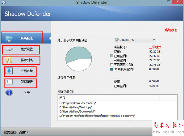 shadow defender中文版進入影子模式不需要重啟計算機 ,而且還能保護多分區。你只要打開界面,選擇你想要的分區,在前面打勾或者去掉勾,沒sd的系統是一張白紙,sd就是在白紙上加一層透明的薄膜。你寫的任何東西其實都只是在薄膜上,雖然看著像是寫在白紙上了。重啟系統就是換另一張薄膜。排除列表:就是預先在薄膜上開出一個個小洞,當然是用戶開的。這樣在有小洞的地方寫東西就直接寫在白紙上了。